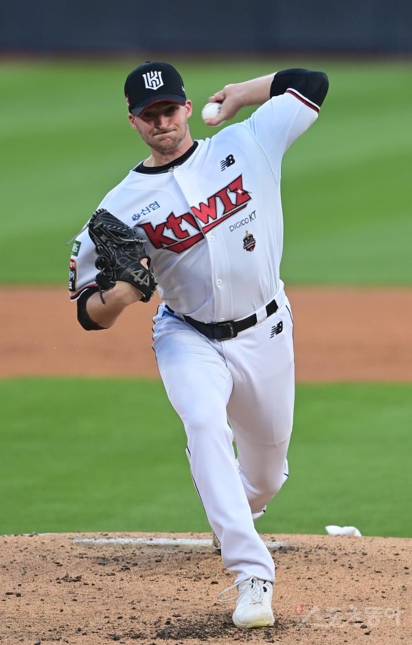 28일 경기도 수원KT위즈파크에서 열린 ‘2022 신한은행 SOL KBO리그’ KT 위즈와 키움 히어로즈의 경기에서 선발 투수로 마운드에 오른 KT 벤자민이 역투하고 있다.