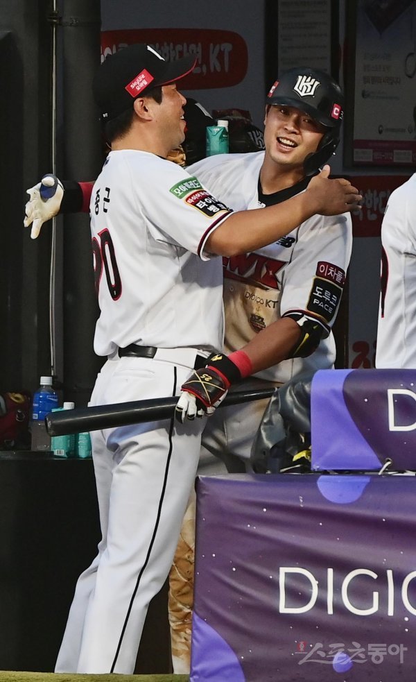 28일 경기도 수원KT위즈파크에서 열린 ‘2022 신한은행 SOL KBO리그’ KT 위즈와 키움 히어로즈의 경기에서 4회말 2사 1루 KT 문상철이 좌월 2점 홈런을 친 후 더그아웃에서 코치와 기쁨을 나누고 있다.
