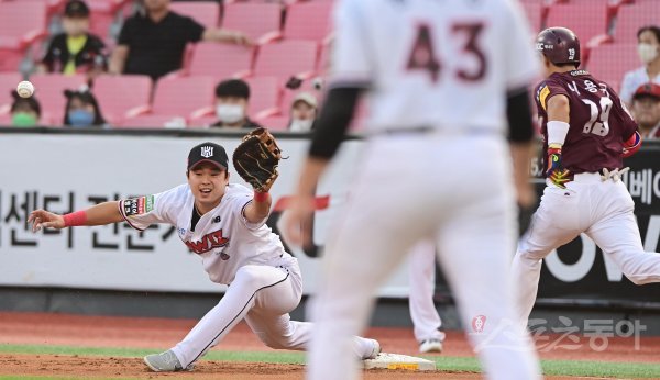 28일 경기도 수원KT위즈파크에서 열린 ‘2022 신한은행 SOL KBO리그’ KT 위즈와 키움 히어로즈의 경기에서 1회초 무사 키움의 내야 땅볼 때 KT 1루수 문상철이 송구된 볼을 놓치고 있다.