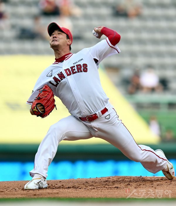 28일 인천 SSG 랜더스필드에서 ‘2022 신한은행 SOL KBO리그’ SSG 랜더스와 LG 트윈스의 경기가 열렸다. SSG 선발투수 김광현이 힘차게 볼을 던지고 있다.