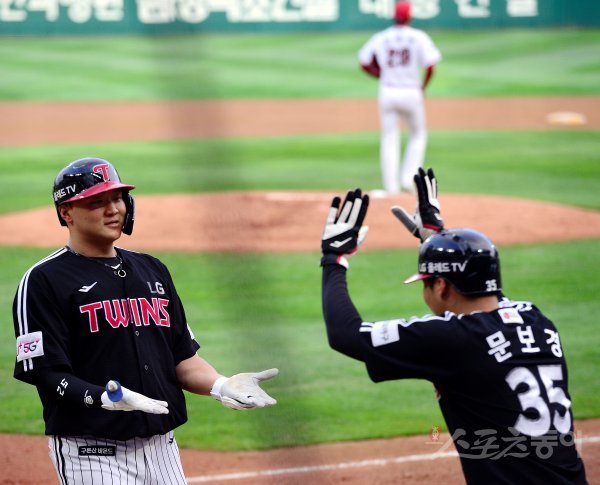 28일 인천 SSG 랜더스필드에서 ‘2022 신한은행 SOL KBO리그’ SSG 랜더스와 LG 트윈스의 경기가 열렸다. 3회초 무사 1루에서 LG 이재원이 투런 홈런을 쏘아 올린 후 동료의 환영을 받고 있다.