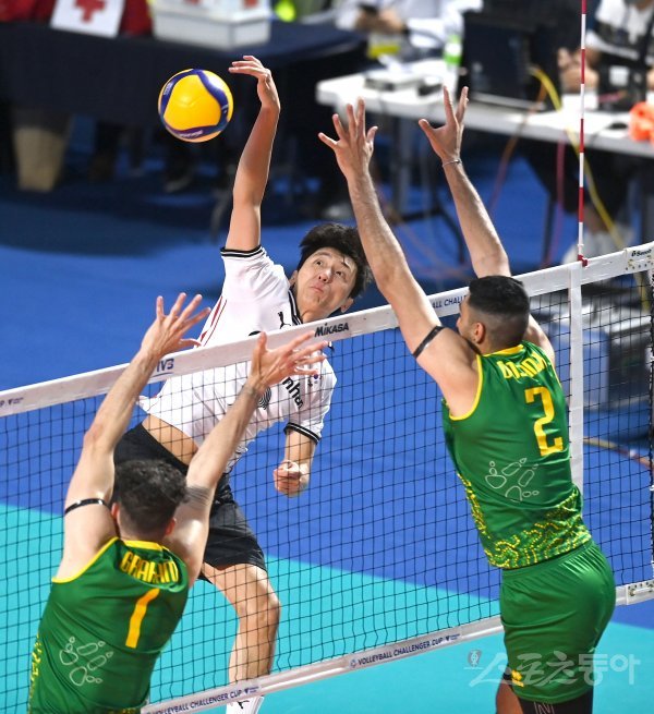 남자 배구대표팀이 28일 서울 잠실학생체육관에서 호주와 2022 국제배구연맹(FIVB) 발리볼챌린저컵 8강전 경기를 가졌다. 한국 곽승석이 호주의 블로킹 사이크 스파이크 공격을 하고 있다.