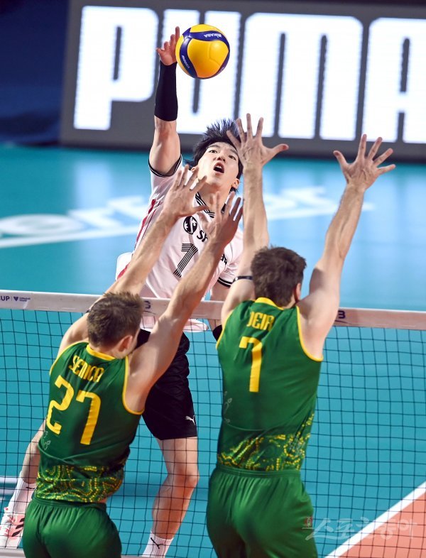 남자 배구대표팀이 28일 서울 잠실학생체육관에서 호주와 2022 국제배구연맹(FIVB) 발리볼챌린저컵 8강전 경기를 가졌다. 한국 허수봉이 호주의 블로킹 사이크 스파이크 공격을 하고 있다.