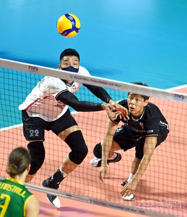 남자 배구대표팀이 28일 서울 잠실학생체육관에서 호주와 2022 국제배구연맹(FIVB) 발리볼챌린저컵 8강전 경기를 가졌다. 한국 신영석이 디그를 하고 있다.