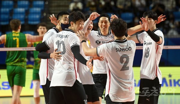 남자 배구대표팀이 28일 서울 잠실학생체육관에서 호주와 2022 국제배구연맹(FIVB) 발리볼챌린저컵 8강전 경기를 가졌다. 한국 나경복이 공격 득점에 성공한 후 팀 동료들과 기뻐하고 있다.