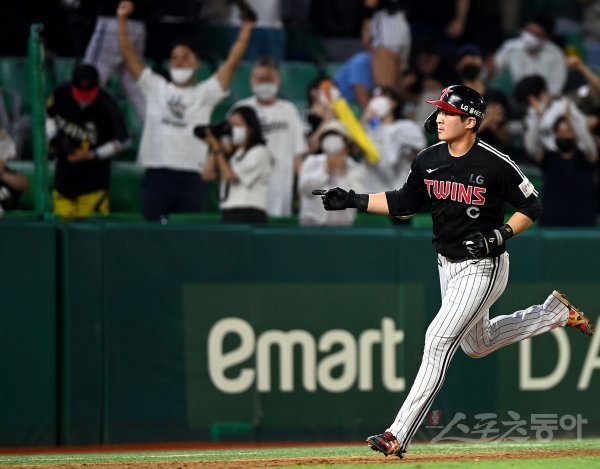 28일 인천 SSG 랜더스필드에서 ‘2022 신한은행 SOL KBO리그’ SSG 랜더스와 LG 트윈스의 경기가 열렸다. 9회초 2사에서 LG 오지환이 4-4 동점 솔로 홈런을 쏘아 올린 후 그라운드를 돌며 환호하고 있다.