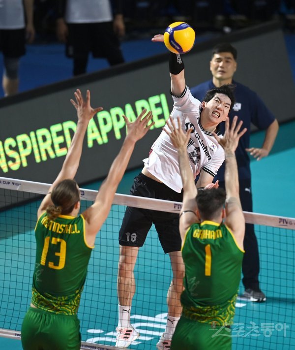 남자 배구대표팀이 28일 서울 잠실학생체육관에서 호주와 2022 국제배구연맹(FIVB) 발리볼챌린저컵 8강전 경기를 가졌다. 한국 허수봉이 호주의 블로킹 사이크 스파이크 공격을 하고 있다.