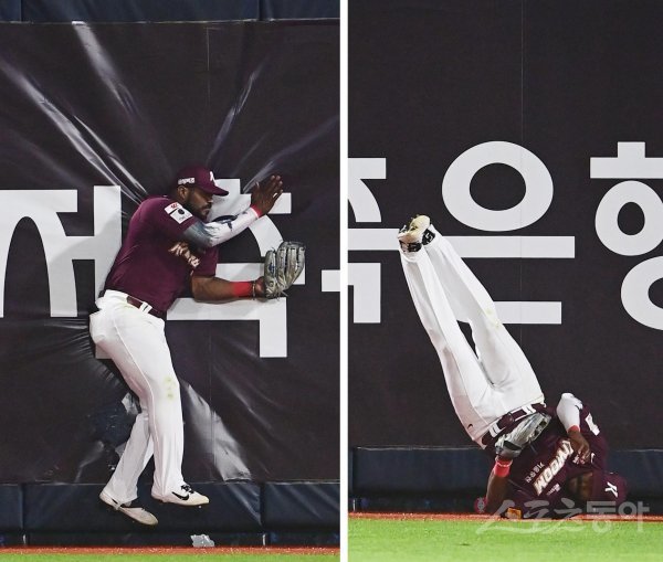 28일 경기도 수원KT위즈파크에서 열린 ‘2022 신한은행 SOL KBO리그’ KT 위즈와 키움 히어로즈의 경기에서 8회말 무사 KT의 뜬공을 잡은 키움 푸이그가 펜스에 충돌한 후 그라운드에 쓰러지고 있다.