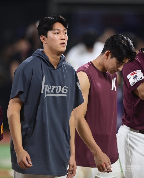 28일 경기도 수원KT위즈파크에서 열린 ‘2022 신한은행 SOL KBO리그’ KT 위즈와 키움 히어로즈의 경기에서 KT에 2-8로 패한 키움 안우진과 이정후가 아쉬워하고 있다.