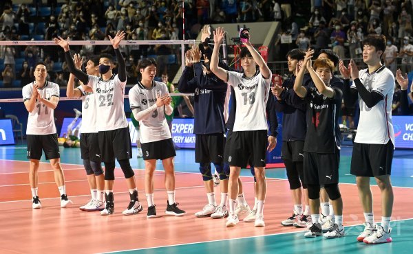 남자 배구대표팀이 28일 서울 잠실학생체육관에서 호주와 2022 국제배구연맹(FIVB) 발리볼챌린저컵 8강전 경기를 가졌다. 세트스코어 3-2 역전승을 거둔 한국 선수들이 기뻐하고 있다.