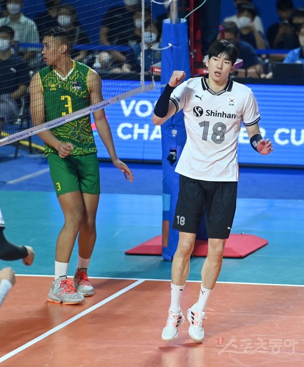 남자 배구대표팀이 28일 서울 잠실학생체육관에서 호주와 2022 국제배구연맹(FIVB) 발리볼챌린저컵 8강전 경기를 가졌다. 한국 허수봉이 득점에 성공한 후 기뻐하고 있다.