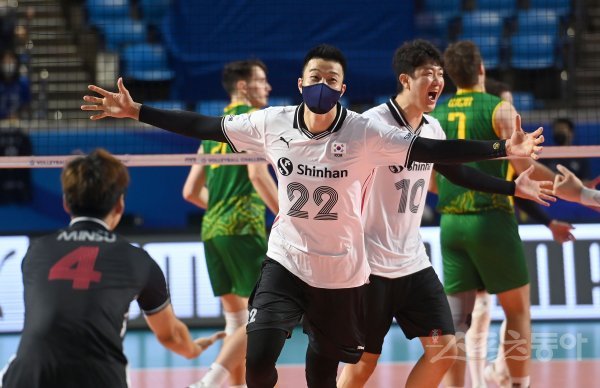 남자 배구대표팀이 28일 서울 잠실학생체육관에서 호주와 2022 국제배구연맹(FIVB) 발리볼챌린저컵 8강전 경기를 가졌다. 한국 신영석이 블로킹 득점에 성공한 후 기뻐하고 있다.