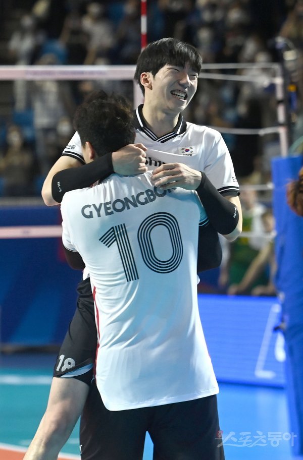 남자 배구대표팀이 28일 서울 잠실학생체육관에서 호주와 2022 국제배구연맹(FIVB) 발리볼챌린저컵 8강전 경기를 가졌다. 한국 허수봉이 승리를 확정지은 후 기뻐하고 있다.