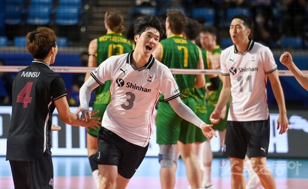 남자 배구대표팀이 28일 서울 잠실학생체육관에서 호주와 2022 국제배구연맹(FIVB) 발리볼챌린저컵 8강전 경기를 가졌다. 한국 황경민이 공격 득점에 성공한 후 기뻐하고 있다.