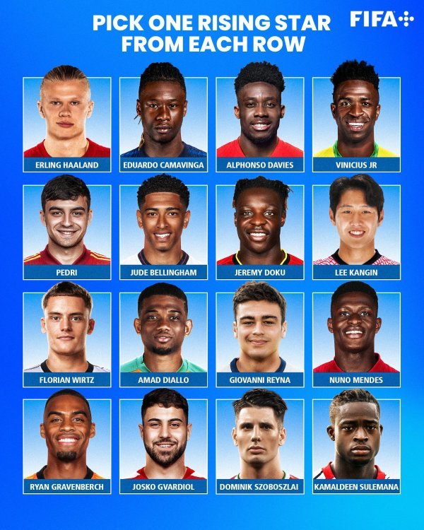FIFA는 29일(한국시간) 월드컵관련 소셜미디어를 통해 16명의 유망주를 소개하면서 ‘한 줄에서 1명씩 골라 앞으로 10년을 이끌 각자의 팀을 꾸려보라’고 제안했다.