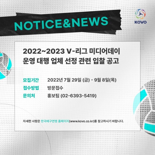 KOVO는 29일 문화체육관광부와 국민체육진흥공단이 지원하는 도드람 2022-23시즌 V-리그 미디어데이 운영 대행업체를 모집한다고 전했다.