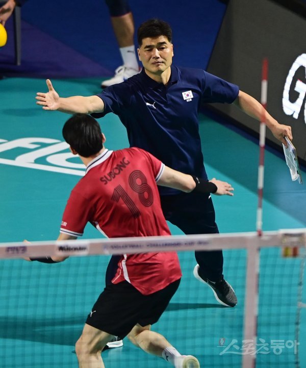 31일 서울 잠실학생체육관에서 열린 ‘서울 2022 국제배구연맹(FIVB) 발리볼챌린저컵’ 한국과 체코의 3, 4위전 경기에서 한국 임도헌 감독이 득점에 성공한 선수와 하이파이브를 하고 있다.