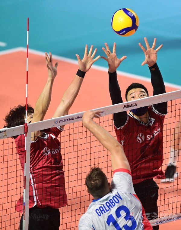 31일 서울 잠실학생체육관에서 열린 ‘서울 2022 국제배구연맹(FIVB) 발리볼챌린저컵’ 한국과 체코의 3, 4위전 경기에서 한국 신영석이 블로킹을 하고 있다.