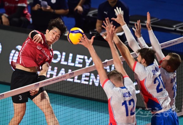31일 서울 잠실학생체육관에서 열린 ‘서울 2022 국제배구연맹(FIVB) 발리볼챌린저컵’ 한국과 체코의 3, 4위전 경기에서 한국 황경민이 체크 블로커 앞에서 스파이크를 때리고 있다.
