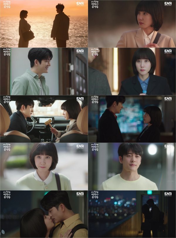 앞서 문지원 작가는 “자기 세계에 집중하는 우영우의 성장에 있어 다른 사람을 자기 세계에 초대하고, 그와 발맞춰가는 것은 빼놓을 수 없는 부분이라고 생각한다. 그래서 영우의 사랑 이야기는 필수적”이라고 밝혔다. 공감과 위로, 그리고 설렘을 넘어 ‘사랑’으로 진화한 우영우와 이준호의 설레는 변화가 작품에 중요한 요소라는 것. 이에 제작진은 우영우, 이준호의 감정 변천사를 짚었다.