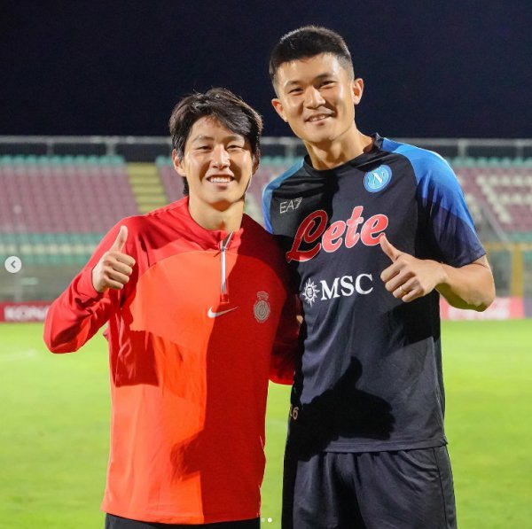 이강인의 소속 팀 스페인 프로축구 마요르카는 2일(이하 한국시간) 소셜미디어를 통해 이강인이 최근 이탈리아 프로축구 나폴리로 이적한 김민재와 함께 찍은 사진을 게재하며 “반가워하는 한국의 선후배”라는 사진 설명을 달았다.