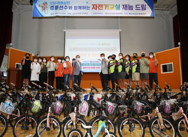 국민체육진흥공단 경주사업총괄본부는 7월 27일 충북 청주시 늘푸른아동원에서 ‘경륜선수와 함께하는 자전거 재능 드림과 기부금 전달식’을 진행했다. 이번 기부는 경륜 훈련지인 대전지부와 미원지부 선수들의 요청으로 이루어졌다. 경제적으로 어려움을 겪고 있는 아동, 청소년들에게 자전거 40대와 안전모 등 1000만원 상당의 물품을 전달했다. 자전거 전달에 이어 행사에 참석한 경륜 대전, 미원지부 소속선수 8명은 아이들이 안전하게 자전거를 타고 즐길 수 있도록 강습도 진행했다. 자전거의 각종 기능, 안전모 착용요령, 자전거 타고 내리기, 안전 수칙, 안전한 라이딩 방법 등을 아이들의 눈높이에 맞춰 실시했다.