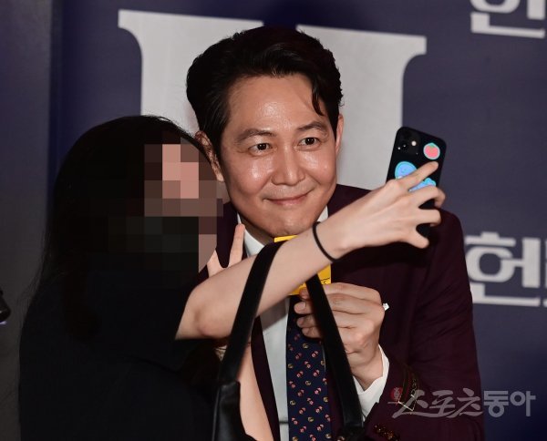 배우 이정재가 2일 서울 강남구 삼성동 메가박스 코엑스점에서 열린 영화 ‘헌트’ 쇼케이스에서 팬과 기념 촬영을 하고 있다.