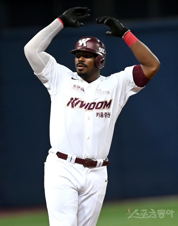 2일 서울 고척스카이돔에서 ‘2022 신한은행 MY CAR KBO리그’ SSG 랜더스와 키움 히어로즈 경기가 열렸다. 3회말 2사 2,3루 키움 푸이그가 2타점 중전 2루타를 치고 2루에서 환호하고 있다.