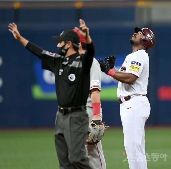 2일 서울 고척스카이돔에서 ‘2022 신한은행 MY CAR KBO리그’ SSG 랜더스와 키움 히어로즈 경기가 열렸다. 3회말 2사 2,3루 키움 푸이그가 2타점 중전 2루타를 치고 2루에서 기뻐하고 있다.