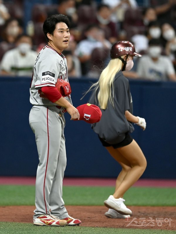 2일 서울 고척스카이돔에서 ‘2022 신한은행 MY CAR KBO리그’ SSG 랜더스와 키움 히어로즈 경기가 열렸다. 6회말 무사 1,2루 키움 보내기번트 때 SSG 최민준이 3루 송구 실책으로 실점한 후 아쉬워하고 있다.