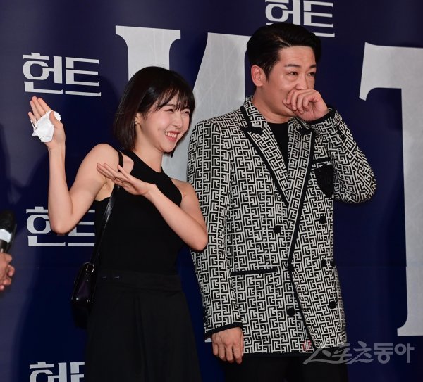 배우 주현영, 허성태가 2일 서울 강남구 삼성동 메가박스 코엑스점에서 열린 영화 ‘헌트’ VIP 시사회에서 포즈를 취하고 있다.