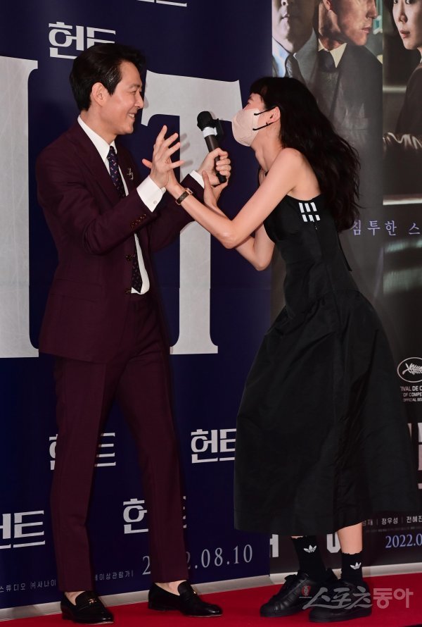 배우 이정재와 정호연이 2일 서울 강남구 삼성동 메가박스 코엑스점에서 열린 영화 ‘헌트’ VIP 시사회에서 인사하고 있다.