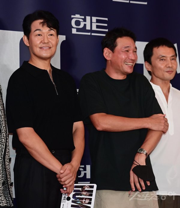 배우 박성웅과 황정민이 2일 서울 강남구 삼성동 메가박스 코엑스점에서 열린 영화 ‘헌트’ VIP 시사회에서 포즈를 취하고 있다.