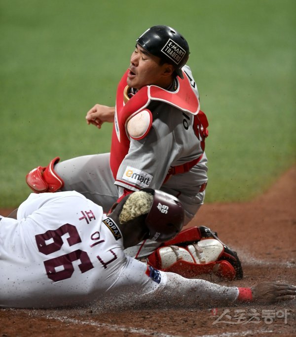 2일 서울 고척스카이돔에서 ‘2022 신한은행 MY CAR KBO리그’ SSG 랜더스와 키움 히어로즈 경기가 열렸다. 7회말 1사 3루 키움 1루수 앞 땅볼 때 3루주자 푸이크가 홈으로 달렸으나 태그 아웃되고 있다.