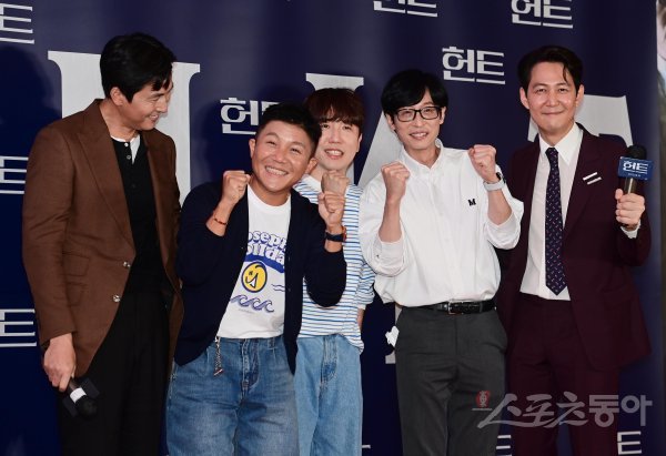 배우 정우성, 개그맨 조세호, 남창희, 유재석, 이정재가 2일 서울 강남구 삼성동 메가박스 코엑스점에서 열린 영화 ‘헌트’ VIP 시사회에서 포즈를 취하고 있다.