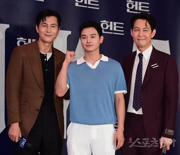 배우 정우성, 장동주, 이정재가 2일 서울 강남구 삼성동 메가박스 코엑스점에서 열린 영화 ‘헌트’ VIP 시사회에서 포즈를 취하고 있다.