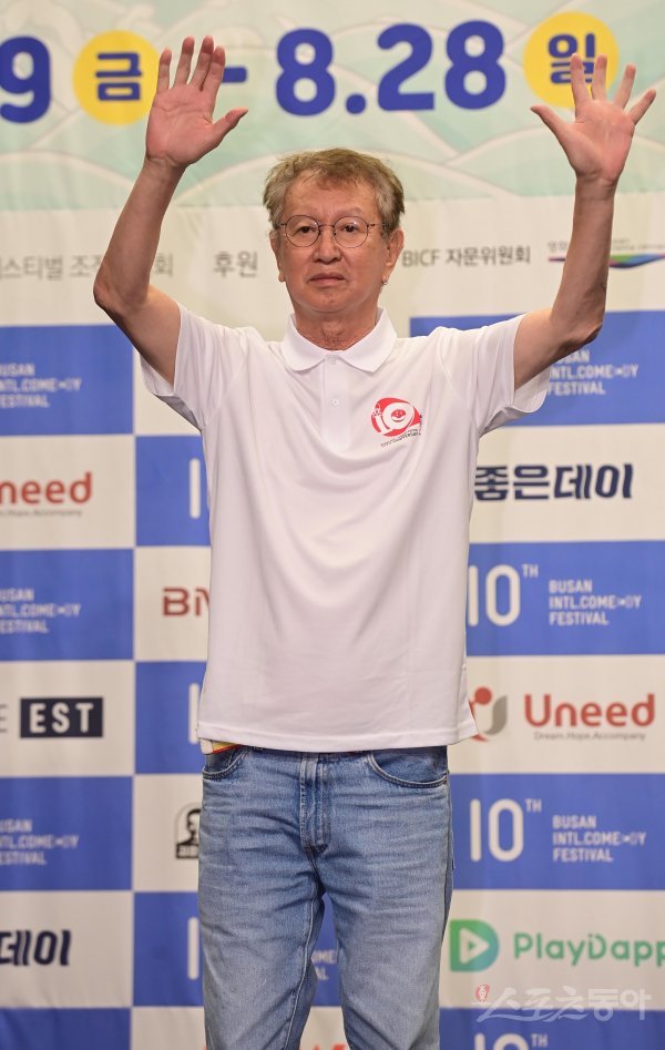 코미디언 전유성이 3일 서울 마포구 상암동 스탠포드호텔 서울에서 열린 ‘제10회 부산국제코미디페스티벌’ 공식 기자회견에서 포즈를 취하고 있다.