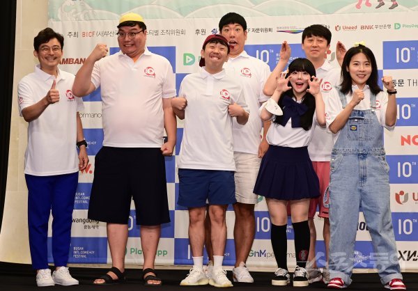 공연팀 급식왕 멤버 남하리, 이은호, 류용현, 홍나영, 김범준, 이상수, 남태령이 3일 서울 마포구 상암동 스탠포드호텔 서울에서 열린 ‘제10회 부산국제코미디페스티벌’ 공식 기자회견에서 포즈를 취하고 있다.