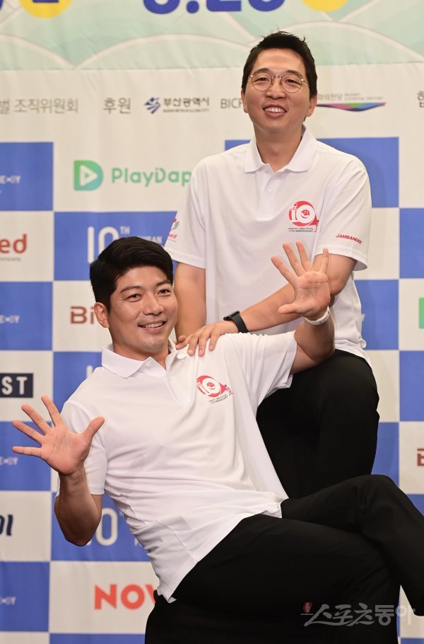 코미디언 김재욱, 정범균이 3일 서울 마포구 상암동 스탠포드호텔 서울에서 열린 ‘제10회 부산국제코미디페스티벌’ 공식 기자회견에서 포즈를 취하고 있다.