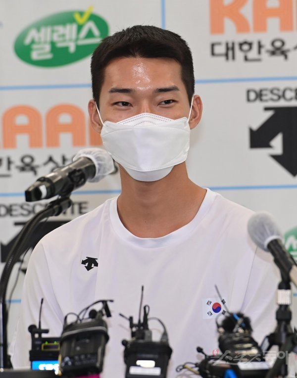 높이뛰기 국가대표 우상혁이 3일 서울 송파구 방이동 서울올림픽파크텔에서 열린 세계육상선수권대회 메달획득에 대한 포상금 수여식 겸 세계다이아몬드 파이널 대회 출정식에서 인터뷰를 하고 있다.