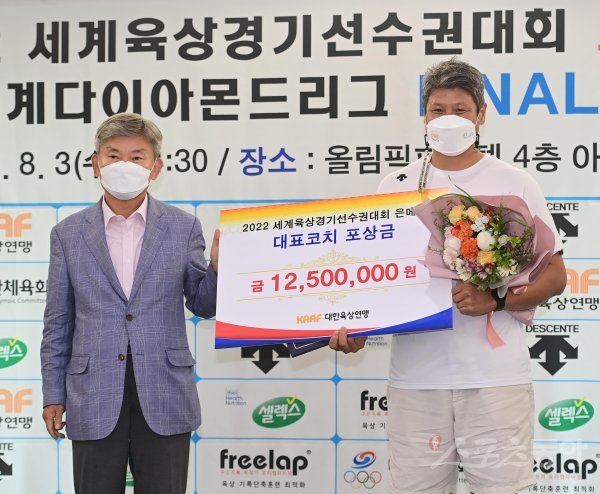 김도균 코치가 3일 서울 송파구 방이동 서울올림픽파크텔에서 열린 세계육상선수권대회 메달획득에 대한 포상금 수여식 겸 세계다이아몬드 파이널 대회 출정식에서 임대기 대한육상연맹 회장으로부터 지도자 포상금을 받고 있다.