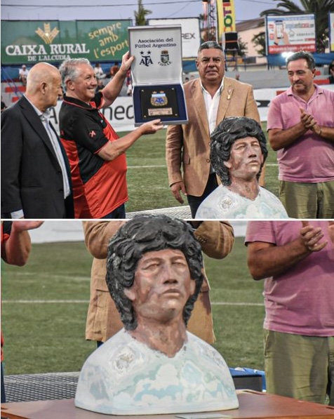 ESPN에 따르면 미라도나의 흉상은 2일(현지시각) 스페인 발렌시아의 소도시 라르쿠디아(L\'Alcudia)에서 열린 20세 이하 국제 축구 대회 ‘COTIF Under-20’ 결승전 아르헨티나 U-20 대표 대 발렌시아 아카데미의 킥오프 전 공개됐다. 작품은 스페인 예술가 라파엘 페리가 제작했다.