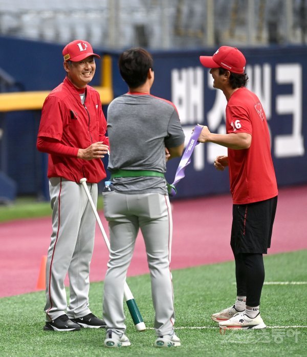 3일 서울 고척스카이돔에서 ‘2022 신한은행 MY CAR KBO리그’ SSG 랜더스와 키움 히어로즈 경기가 열린다. 훈련 중 SSG 김원형 감독과 김성현이 이야기를 하고 있다.
