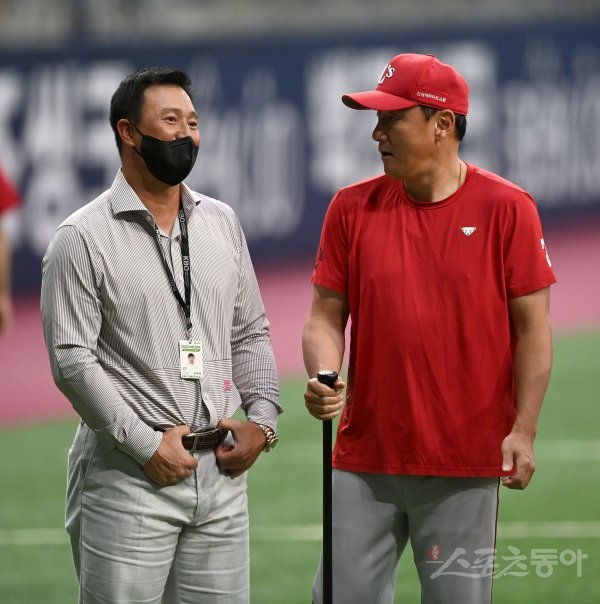 3일 서울 고척스카이돔에서 ‘2022 신한은행 MY CAR KBO리그’ SSG 랜더스와 키움 히어로즈 경기가 열린다. 훈련 중 SSG 조원우 코치와 김재현 해설위원이 이야기를 하고 있다.