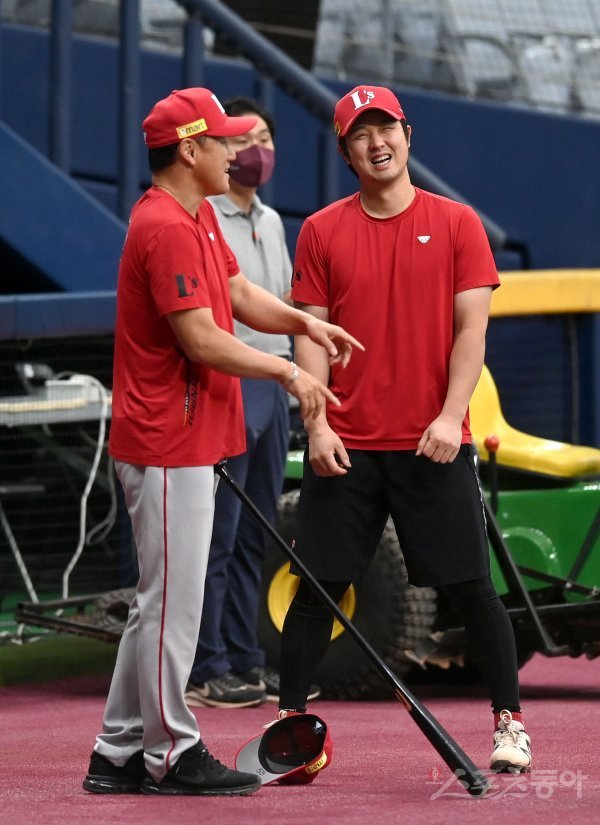 3일 서울 고척스카이돔에서 ‘2022 신한은행 MY CAR KBO리그’ SSG 랜더스와 키움 히어로즈 경기가 열린다. SSG 조원우 코치와 최정이 훈련 중 이야기를 하고 있다.