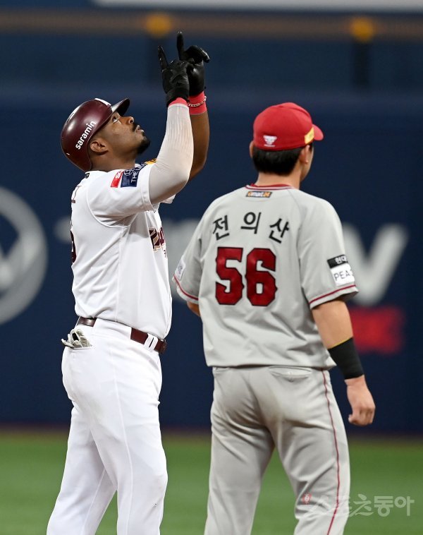 3일 서울 고척스카이돔에서 ‘2022 신한은행 MY CAR KBO리그’ SSG 랜더스와 키움 히어로즈 경기가 열렸다. 3회말 2사 1루 키움 푸이그가 1타점 중전 2루타를 치고 2루에서 기뻐하고 있다.