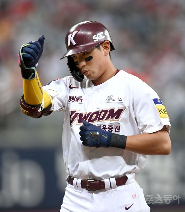 3일 서울 고척스카이돔에서 ‘2022 신한은행 MY CAR KBO리그’ SSG 랜더스와 키움 히어로즈 경기가 열렸다. 1회말 1사 2루 키움 이정후가 선제 1타점 적시타를 치고 1루에서 기뻐하고 있다.