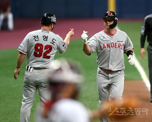 3일 서울 고척스카이돔에서 ‘2022 신한은행 MY CAR KBO리그’ SSG 랜더스와 키움 히어로즈 경기가 열렸다. 9회초 무사 1루 SSG 최정이 좌중월 투런 홈런을 날리고 그라운드를 돌며 하이파이브 하고 있다.
