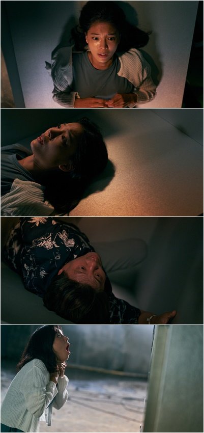 우선 소진(임세미), 동혁(성지루), 혜린(한지원)이 알 수 없는 공간에 갇혀 겁에 질린 얼굴로 누워 있는 모습에서 세 사람이 느끼는 공포와 두려움이 생생하게 전해진다. 특히 사방이 벽에 막혀 움직일 수조차 없어 보이는 공간이 기이한 분위기를 조성하며 긴장감을 더한다. 낯선 공간에서 자기 목을 조르는 소진의 표정 또한 섬뜩한 느낌을 전달하며 공포를 자아낸다.