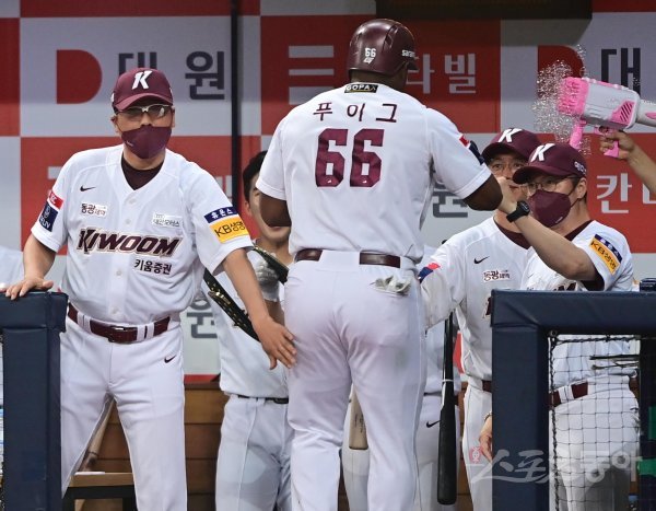 4일 서울 고척스카이돔에서 열린 ‘2022 신한은행 SOL KBO리그’ 키움 히어로즈와 SSG 랜더스의 경기에서 6회말 무사 키움 푸이그가 좌월 솔로 홈런을 친 후 홍원기 감독의 축하를 받고 있다.